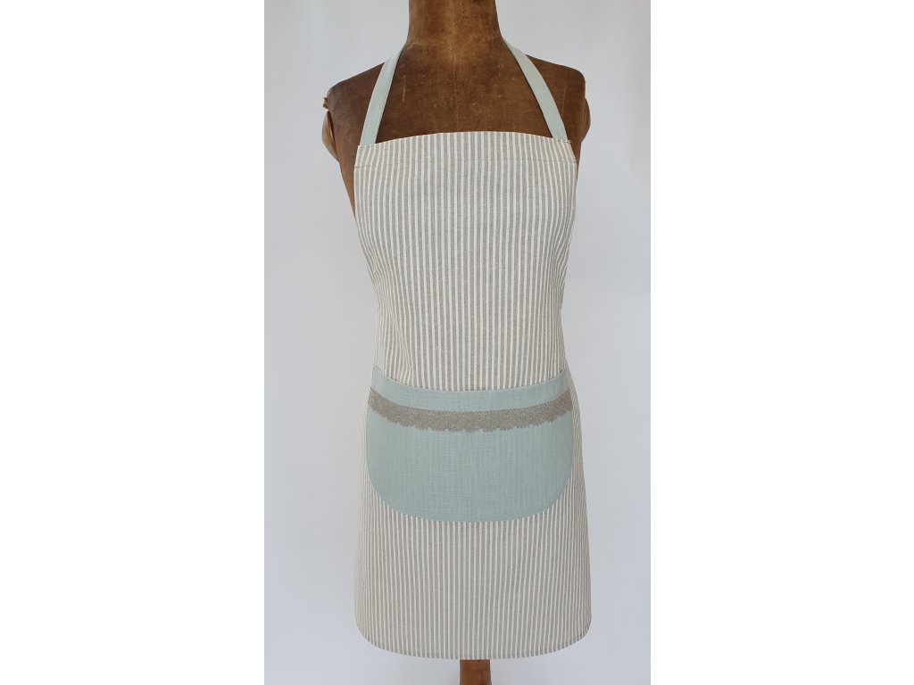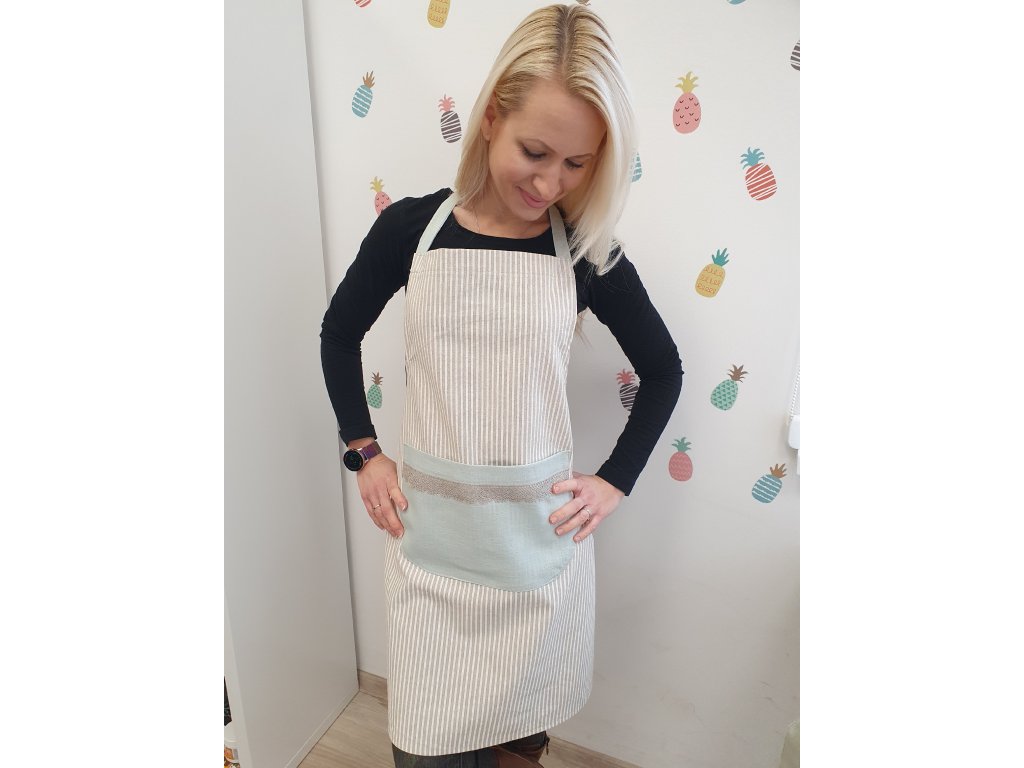 Autorská designová kuchyňská zástěra, díky které se kombinací bavlněné látky s pruhy, kapsy ze lnu v barvě mint a krásné krajky, dostanete do romantické nálady a vaření či pečení vám půjde lépe od ruky a od ♥